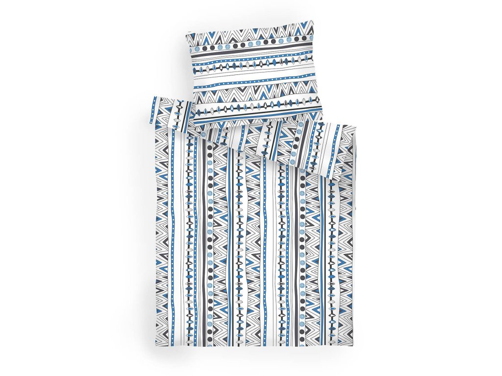 Stylové ložní prádlo Indián denim s výrazným geometrickým vzorem v odstínech modré, černé a bílé přináší do ložnice energii a originalitu. Motiv inspirovaný etnickými prvky v kombinaci s denimovým tónem působí moderně a zároveň tradičně. Povlečení doporučujeme kombinovat s prostěradly v barvě bílá, tmavě šedá, černá nebo denim.